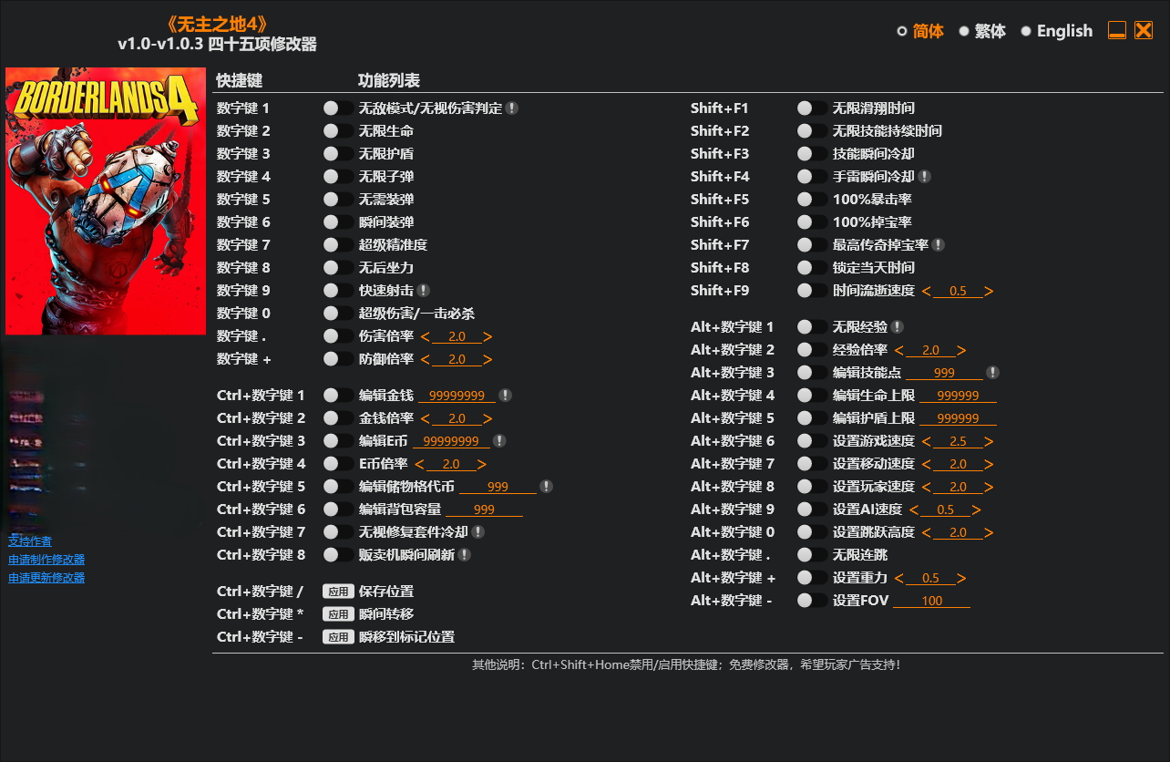 修改器截图 版本 v1.0-v1.3.0 Plus 45 下载地址 #免责声明# 本站提供的资源转载自国内外各大媒体和网络,仅供试玩体验;不得将上述内容用于商业或者非法用途,否则,一切后果请用户自负。您必须在下载后的24个小时之内,从您的电脑中彻底删除上述内容。如果您喜欢该游戏内容,请支持正版,购买注册,得到更好的正版服务。我们非常重视版权问题,如有侵权请邮件与我们联系处理。敬请谅解!